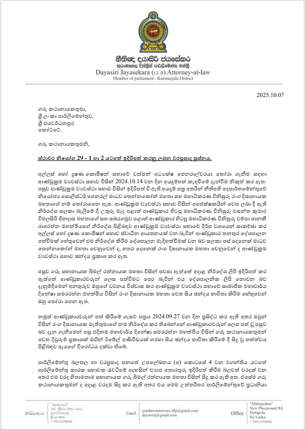 අල්ලස් හෝ දූෂණ කොමිෂන් සභාවේ (CIABOC) අධ්යක්ෂ ජනරාල්වරයා ලෙස මහාධිකරණ විනිසුරු රංග දිසානායක මහතා පත් කිරීමේදී ආණ්ඩුක්රම ව්යවස්ථා සභාවේ සාමාජිකයින් නොමඟ යැවීමක් සිදුව ඇති බවට චෝදනා කරමින් පාර්ලිමේන්තු මන්ත්රී, නීතිඥ දයාසිරි ජයසේකර මහතා අද (ඔක්තෝබර් 07) කථානායකවරයා වෙත වරප්රසාද ප්රශ්නයක් ඉදිරිපත් කර තිබේ.