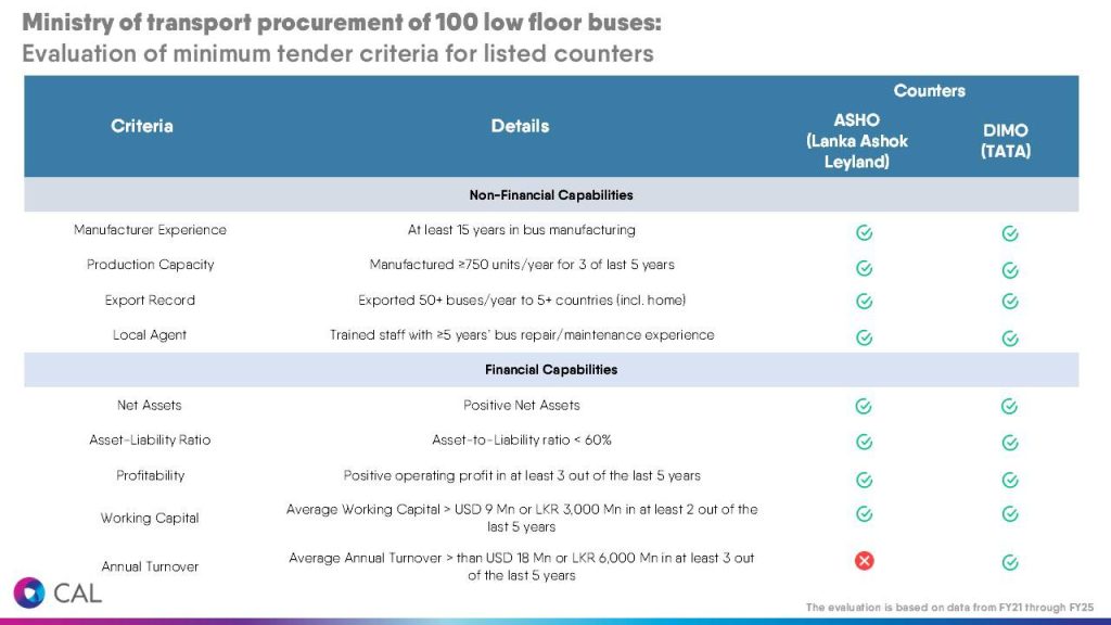 මෙම ටෙන්ඩරය සඳහා ප්‍රධාන වශයෙන් තරඟ වදින දේශීය සමාගම් දෙක වන්නේ ලේලන්ඩ් (Ashok Leyland) බස් රථ දේශීයව එකලස් කරන ලංකා ඇෂෝක් ලේලන්ඩ් (Lanka Ashok Leyland PLC) සමාගම සහ ටාටා (TATA) බස් රථ ආනයනය කරන ඩීමෝ (DIMO PLC) සමාගමයි.