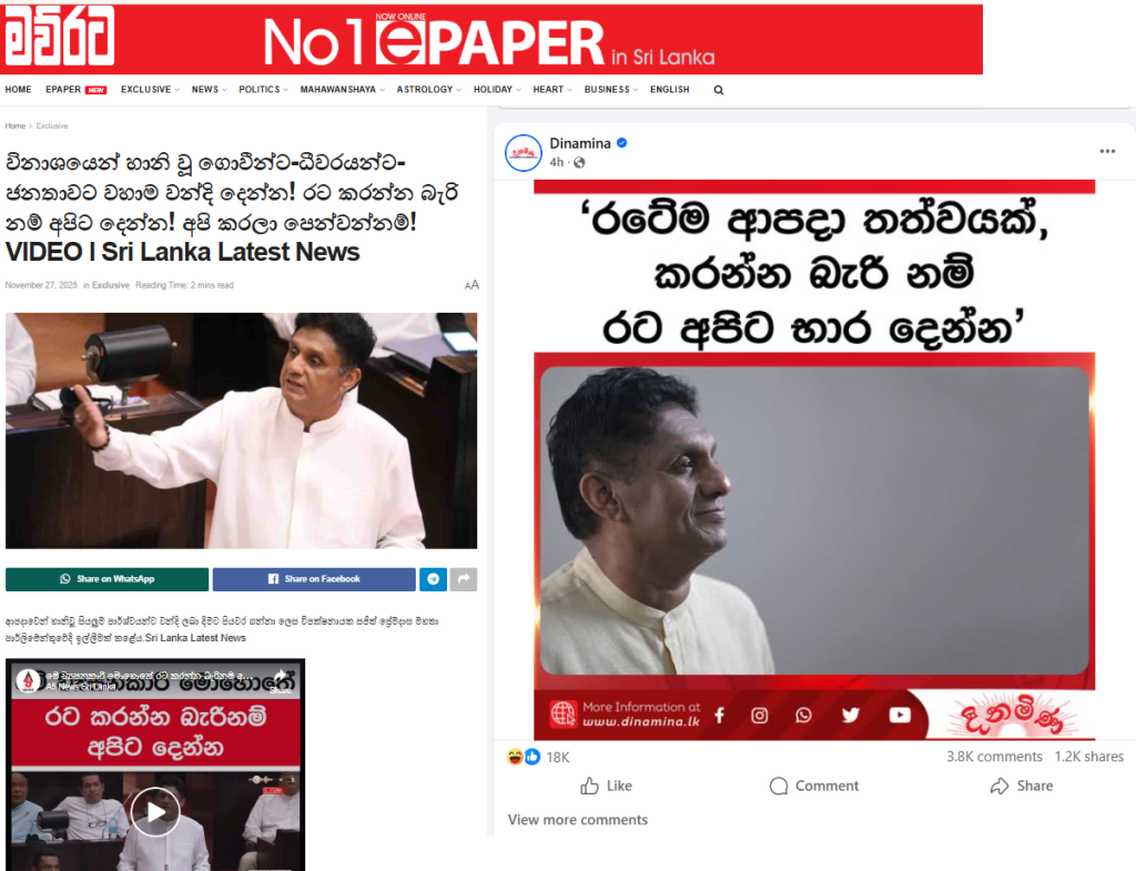 විපක්ෂ නායක සජිත් ප්රේමදාස මහතාගේ කතාවක් විකෘති කර පළ කිරීම සම්බන්ධයෙන් සජබ පාක්ෂිකයන් රජය යටතේ පාලනය වන ‘දිනමිණ’ පුවත්පතට චෝදනා කළද, එම කතාව මුලින්ම විකෘති කොට පල කර ඇත්තේ සජබයට යට හිතවත් බව කියන ‘මව්රට’ පුවත්පතේ වෙබ් අඩවිය වීම මෙහි ඇති බරපතළම සත්යයයි.